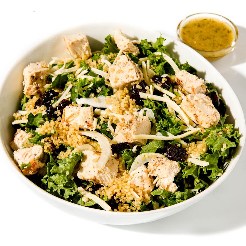 Fennel Pollen, Lacinato Kale, Canola and Olive Oil Blend, Bay Leaf, Extra Virgin Olive Oil, Sherry Vinegar, Black Pepper, Dried Cherries, Garlic, Honey, Dijon Mustard, Kosher Salt, Shallot, Cabbage, Black Pepper, Thyme, White Cheddar Cheese, Quinoa, Chicken Breast, Fennel