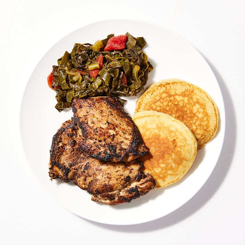 Savor the vibrant flavors of the Caribbean with this dish. Succulent boneless chicken thigh, marinated and grilled to perfection with jerk spices, is complemented by the savory goodness of Caribbean-style johnny cakes and tender braised collard greens. A truly satisfying island feast.