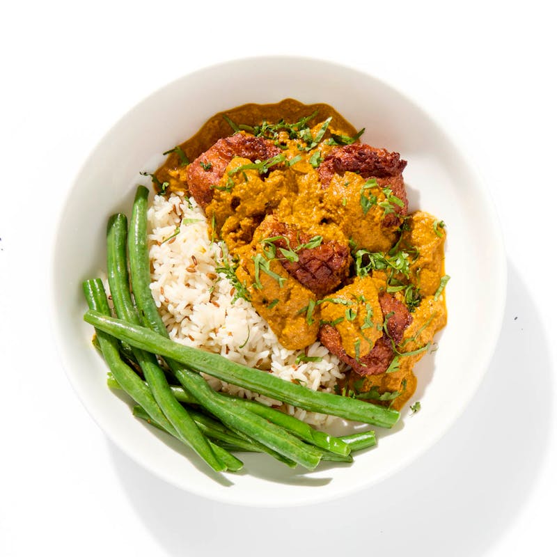 Canola Oil, Paneer Cheese, Canola and Olive Oil Blend, Bay Leaf, Fenugreek, Red Onion, Plum Tomato, Cumin, Coriander, Golden Raisins, Garam Masala, Cashews, Cilantro, Garlic, Cinnamon, Sweet Paprika, Corn Starch, Sugar, Heavy Cream, Basmati Rice, Kosher Salt, Clove, Green Beans, Yukon Potatoes, Ginger, Clarified Butter, Cayenne Powder