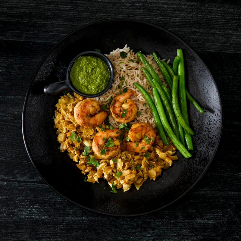 A coastal classic reimagined for the modern table. Shrimp and sweet crab are gently simmered in a coconut-based Goan curry—rich in flavor without overwhelming heat. It's paired with fragrant ginger-cumin rice, blistered haricots verts, and a cool mint chutney.
