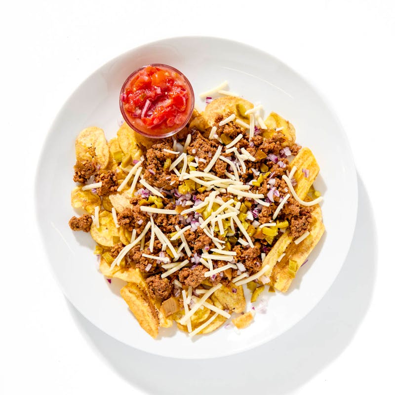 White Cheddar Cheese, Cherry Tomato, Red Onion, Plantain Chips, Avocado Oil, Onion Powder, Garlic Powder, Black Pepper, Cumin, Golden Raisins, Cilantro, Capers, Garlic, Onion, Kosher Salt, Sazon, Lime Juice, Sofrito, Ground Beef, Pickled Jalapeno Peppers, Canned Tomato, Green Olives