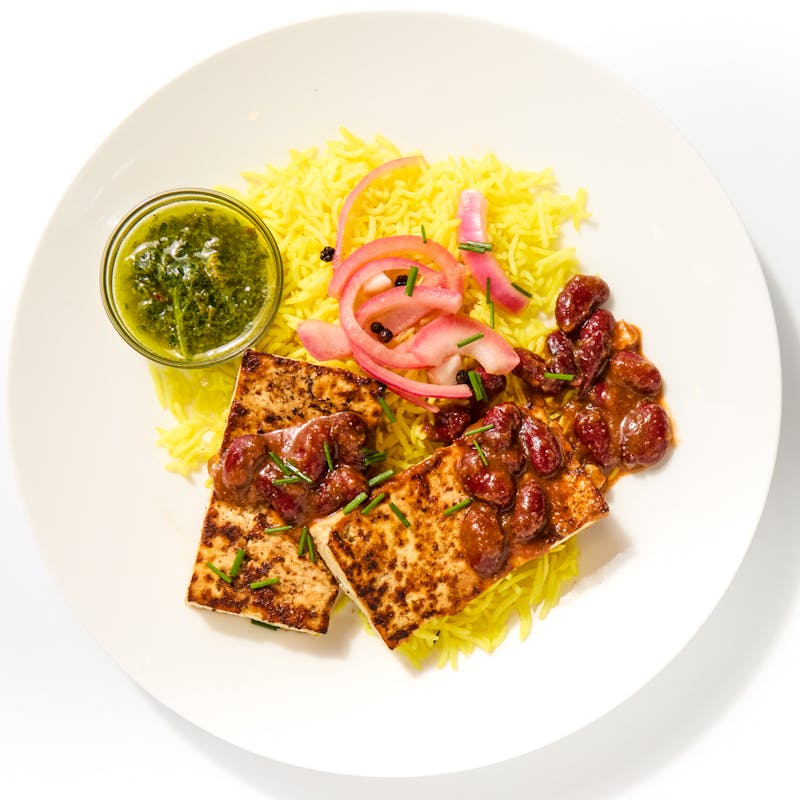 Tofu, Basmati Rice, Red Kidney Beans, Red Onion, Extra Virgin Olive Oil, Canned Tomato, Garlic, Italian Parsley, Sugar, Canola Oil, Red Wine Vinegar, Oregano, Onion, Butter, Garlic Powder, Sofrito, Onion Powder, Kosher Salt, White Vinegar, Black Pepper, Chives, Cilantro, Crushed Red Pepper, Turmeric, Canola and Olive Oil Blend, Vegetable Base, Black Pepper