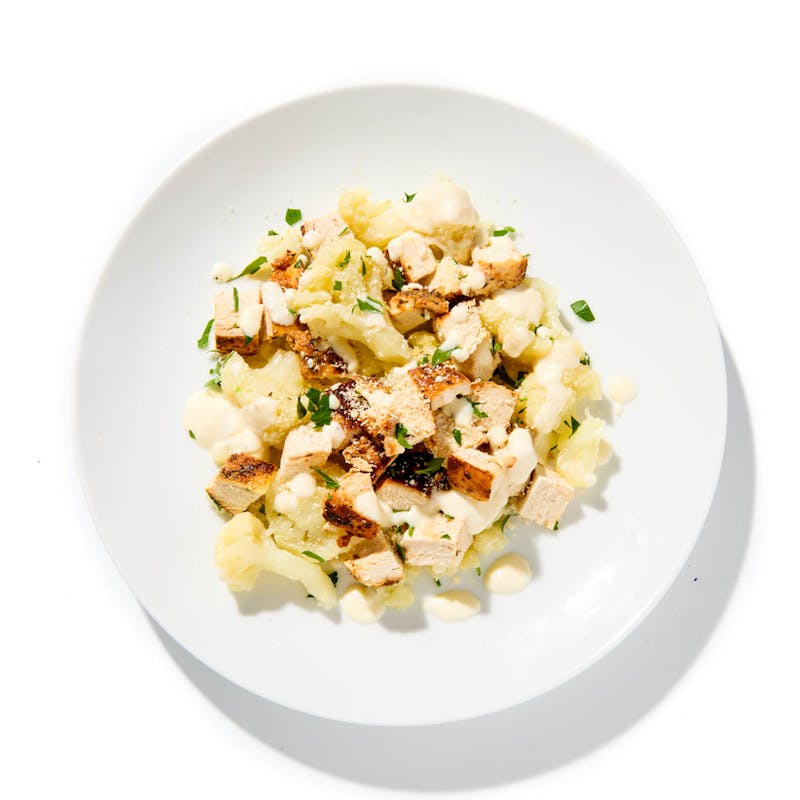 Nutmeg, Butter, Extra Virgin Olive Oil, Garlic Powder, Black Pepper, Garlic, Sweet Paprika, Heavy Cream, Kosher Salt, Parmesan Cheese, Thyme, Chicken Breast, Whole Milk, Italian Parsley, Cauliflower, Parmesan Cheese