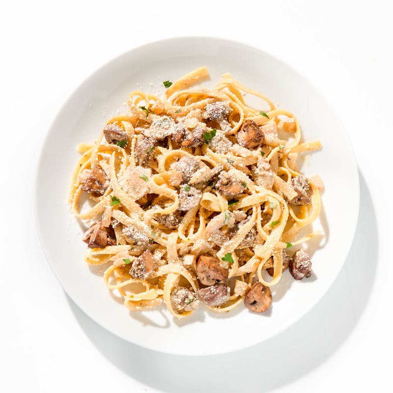 Canola and Olive Oil Blend, Butter, Fettuccini, Vegetable Base, Black Pepper, Garlic, Dijon Mustard, Sweet Paprika, Heavy Cream, Onion, Worcestershire Sauce, Kosher Salt, Balsamic Vinegar Reduction, Buttom Mushroom, Crimini Mushroom, Thyme, White Wine, Italian Parsley, Parmesan Cheese