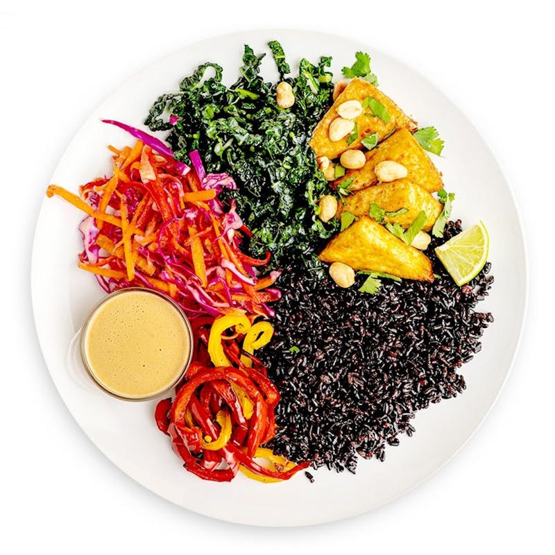 Spread, Peanut Butter, Natural, Lacinato Kale, Rice Vinegar, Black Rice, Sesame Oil, Yellow Bell Pepper, Napa Cabbage, Extra Virgin Olive Oil, Himalayan Pink Salt, Cilantro, Garlic, Agave Syrup, Peanuts, Rainbow Carrots, Gluten Free Tamari, Organic Tofu, Rice Wine Vinegar, Lime, Miso Paste, Ginger, Red Bell Pepper