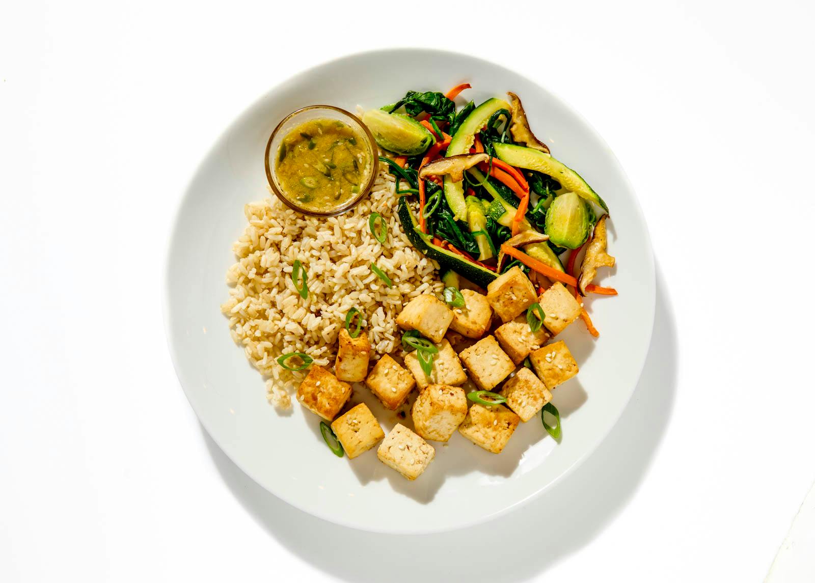 Roasting gives the tofu golden edges and a firm bite, helping it hold onto the sesame-ginger marinade. The vegetable medley brings color and contrast, from spinach and zucchini to roasted carrots and mushrooms. Served with ponzu on the side.