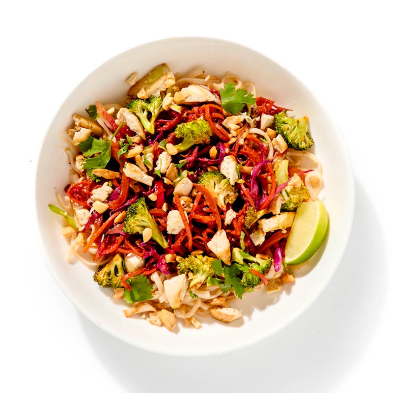 Tofu, Pad Thai Noodles, Bean Sprout, Carrots, Broccoli , Red Cabbage, Orange Bell Pepper, Red Bell Pepper, Peanuts, Extra Virgin Olive Oil, Gluten Free Tamari, Cilantro, Green Onion, Tamarind Paste, Lime, Kaffir Lime, Lime Juice, Rice Wine Vinegar, Agave Syrup, Ginger, Sriracha, Coconut Aminos, Garlic, Kosher Salt
