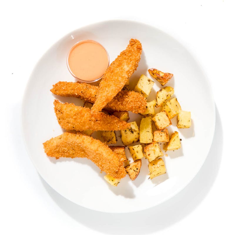 These tilapia tenders are coated in a parmesan-seasoned panko breading spiced with garlic, smoked paprika, and Italian herbs. The fish is sliced into strips, lightly fried until tender inside and golden outside, and served alongside roasted Yukon potatoes tossed with herbs, garlic, and a touch of olive oil. A garlicky hot mayo, blended with Sriracha, brings a touch of creamy heat for dipping.