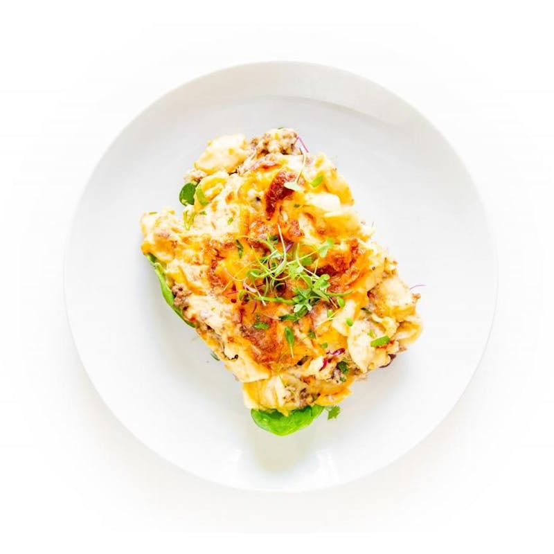 This dish is an ode to Chef Chris’ childhood favorite. Hamburger Helper, but made with fresh ingredients, from scratch with a lot of love. Chef slowly renders seasoned ground beef with garlic and onions, then pairs it up with his classic ooey, gooey mac and cheese. Topped off with some Pepper Jack cheese and seasoned bread crumbs and baked off for that perfectly crisp top, and creamy center. This meal will do well in both the microwave or the oven, it just depends on if you prefer the cheese topping more on the crispier side. A tip from Chef Chris: if you go the oven-route, microwaving it for two minutes first cuts down baking time significantly.