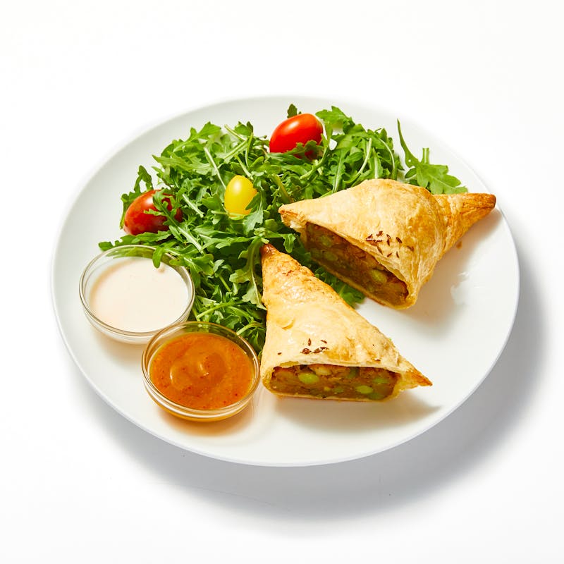 Vegan Puff Pastry, Carom Seeds , Mango Puree, Coriander Seeds, Turmeric, Cumin, Avocado Oil, Cherry Tomato, Garlic Powder, Curry Leaf, Cilantro, Sugar, Potato, Onion, Peas, Kosher Salt, Espelette Pepper , Lime Juice, Lemon Juice, Greek Yogurt, Ginger, Chaat Masala, Arugula, Citric Acid