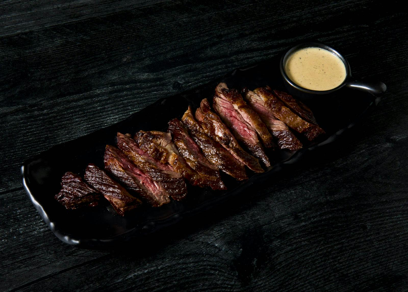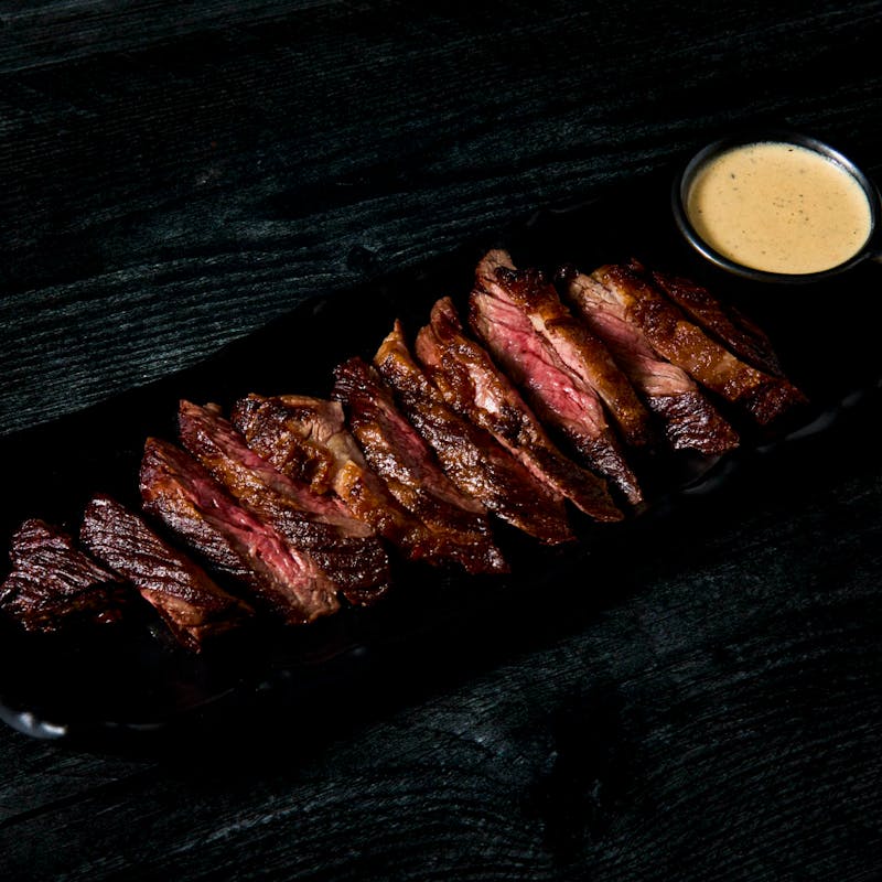 Skirt steak is seasoned with kosher salt and cracked black pepper, then seared on a flat top until caramelized. It's sliced and served with a classic au poivre sauce made from green peppercorns, shallots, and cognac, finished with heavy cream and a touch of beef base for extra richness.