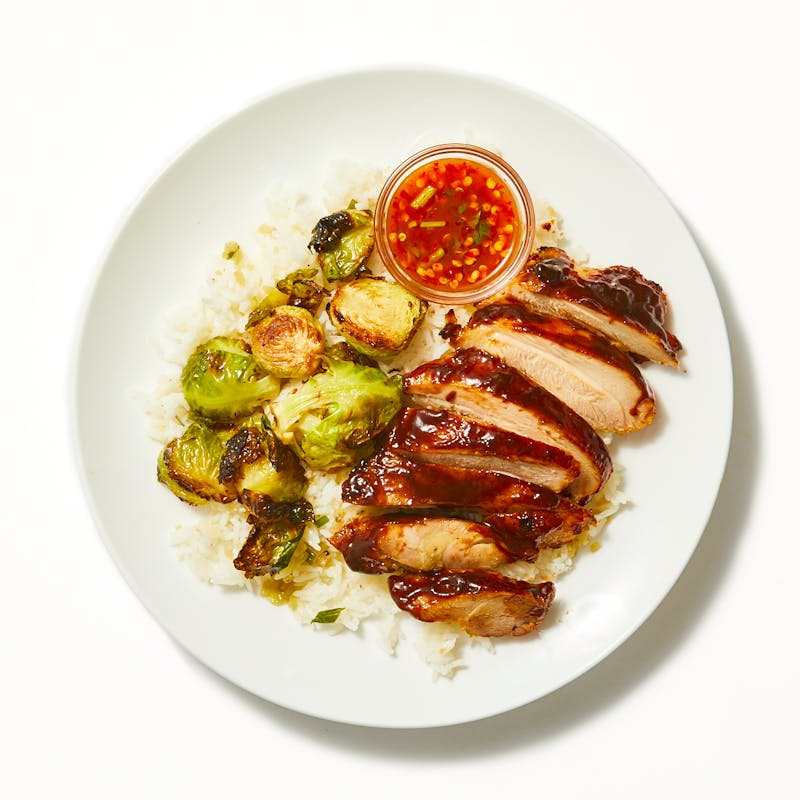 Chicken Thigh, Canola and Olive Oil Blend, Fish Sauce, Black Pepper, Cilantro, Garlic, Brussel Sprouts, Hoisin Sauce, Thai Chilli, Thai Red Peppers, Sugar, Jasmine Rice, Kosher Salt, Lime Juice, Green Onion, Ginger, Canola Oil