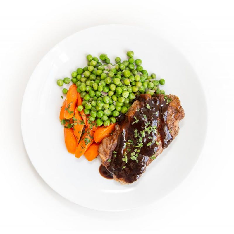 Is there anything more American than a prime piece of beef served with steak sauce and a side of peas and carrots? We didn't think so either! Bistro Steak is a tender cut of beef that comes from the front shoulder. With many similar qualities to a New York strip steak it's no wonder this cut has been an industry secret for years! Chef Pat always serves his sliced, and here it pairs perfectly with glazed carrots and sweet peas. This simple dinner hits the spot any night of the week!