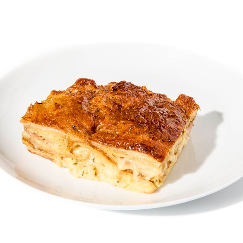 Flaky croissants meet their match in this savory, custard-soaked bake, layered with smoky ham and Gruyère cheese. The croissants are sliced, stuffed, and cubed before being nestled into a Dijon-spiked custard that soaks in overnight. Once baked, the top turns golden while the center stays tender and rich. It’s the kind of dish that anchors a brunch table, or makes a strong case for breakfast-for-dinner.