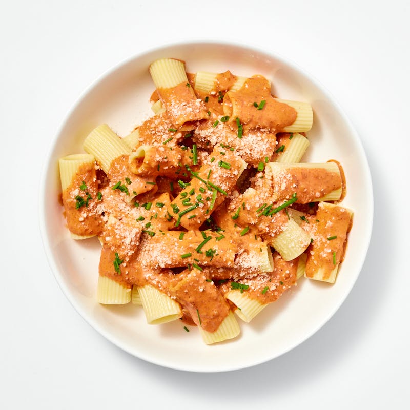 Chives, Turmeric, Coriander, Garam Masala, Tomato Paste, Heavy Cream, Ginger Garlic Paste, Kosher Salt, Shallot, Rigatoni, Vodka, Cayenne Powder, Parmesan Cheese