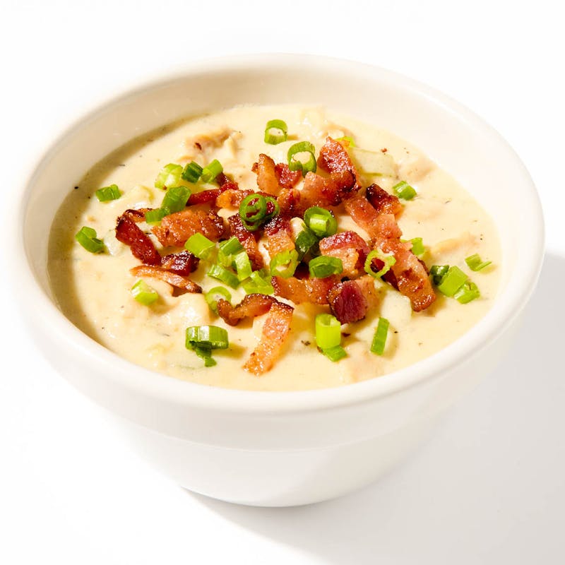 This hearty classic soup features tender clams, perfectly cooked potatoes, and a medley of onions and celery sautéed with smoky bacon in a luscious, velvety broth made from rich cream and aromatic fresh herbs. Each spoonful offers a beautiful balance of flavors and textures, all gently simmered together and topped off with crisp bacon bits and green onions to garnish. Perfect for lunch or dinner, and deliciously soul-satisfying either way.
