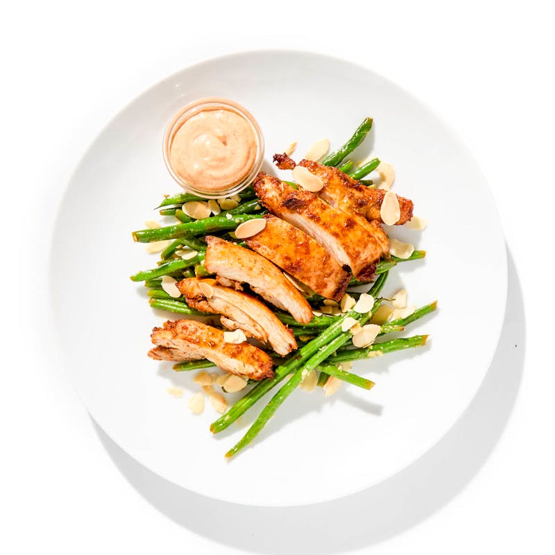 Paprika-rubbed chicken thighs are roasted until the edges caramelize and served over buttery green beans almondine, tossed with toasted almonds, garlic, and a squeeze of lemon. Double down with a paprika aioli on the side for dipping, swiping, or spooning.