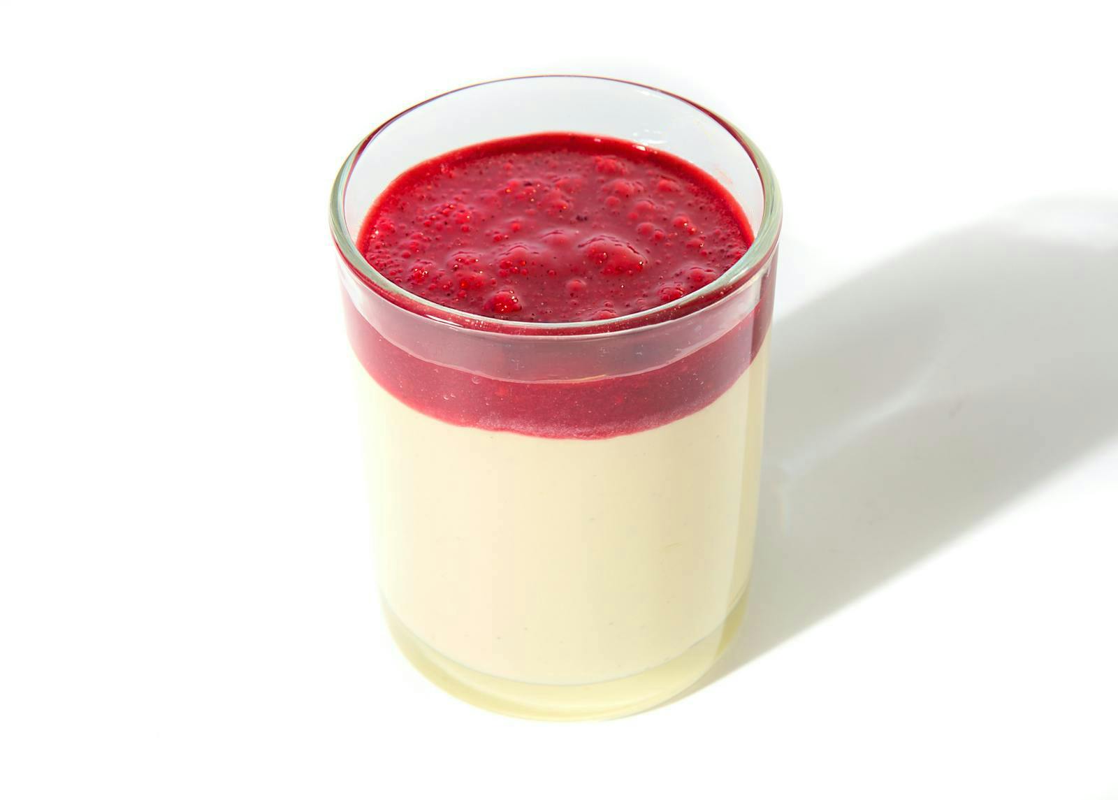 This protein-rich breakfast (or snack) blends full-fat Greek yogurt and cottage cheese, lightly sweetened with honey and vanilla. On top: a tangy berry coulis and sliced almonds for a little crunch.