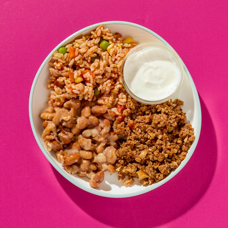 Chef Ivy whips up a flavorful Mexican-inspired meal made just for kids! This plate features taco-style ground beef with lentils and cauliflower, hearty refried beans, fluffy Mexican rice, and sweet corn. A sour cream on the side adds a cool, tangy touch.