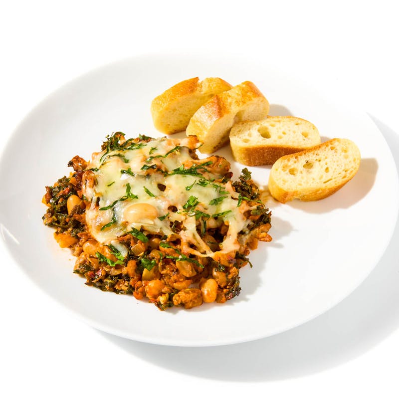 Chef Ivy puts her own spin on a viral favorite with this hearty, Mediterranean-inspired bake. Creamy white beans, garlicky sausage, and wilted kale are simmered with tomato paste and warming spices, then blanketed in sharp cheese and baked until golden and bubbling. It’s served with crusty French bread and a sprinkle of fresh parsley.