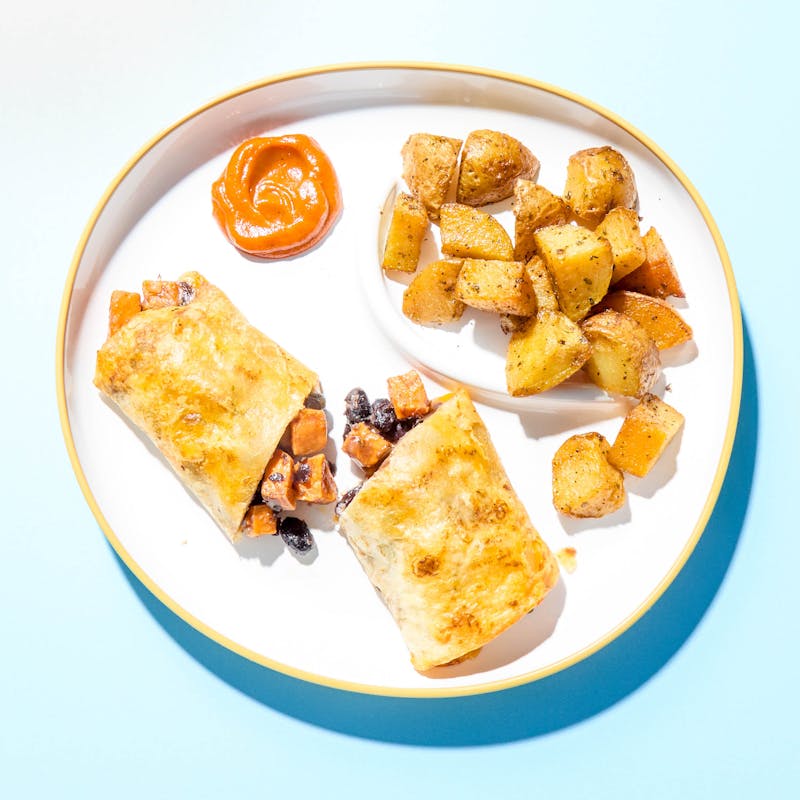 This veggie burrito was designed for kids. With a slightly smaller portion that's perfect for little ones, it's stuffed with seasoned, smashed sweet potatoes, black beans, and two kinds of cheese. Served with crispy roasted potatoes and Chef Ivy's homemade ketchup, it tastes great and is great for your kids, too