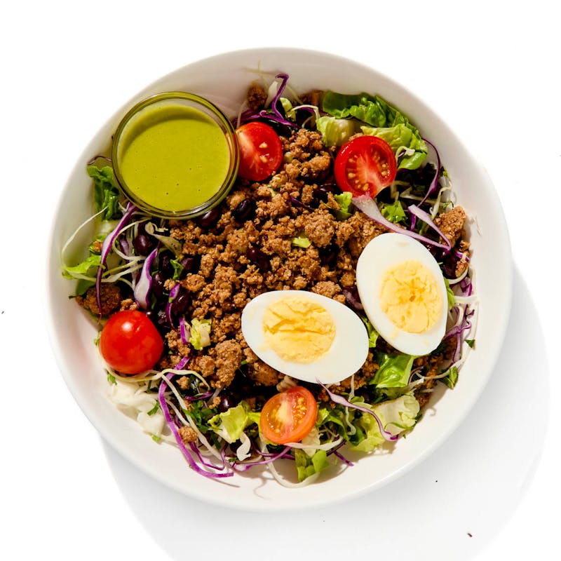 Inspired by the bright flavors of Thai laab. Ground turkey is seasoned with shallot, lemongrass, and toasted spice, then layered over black beans and cherry tomatoes. A soft-boiled egg adds richness, while a creamy yogurt vinaigrette laced with lime and jalapeño keeps things cool and punchy.