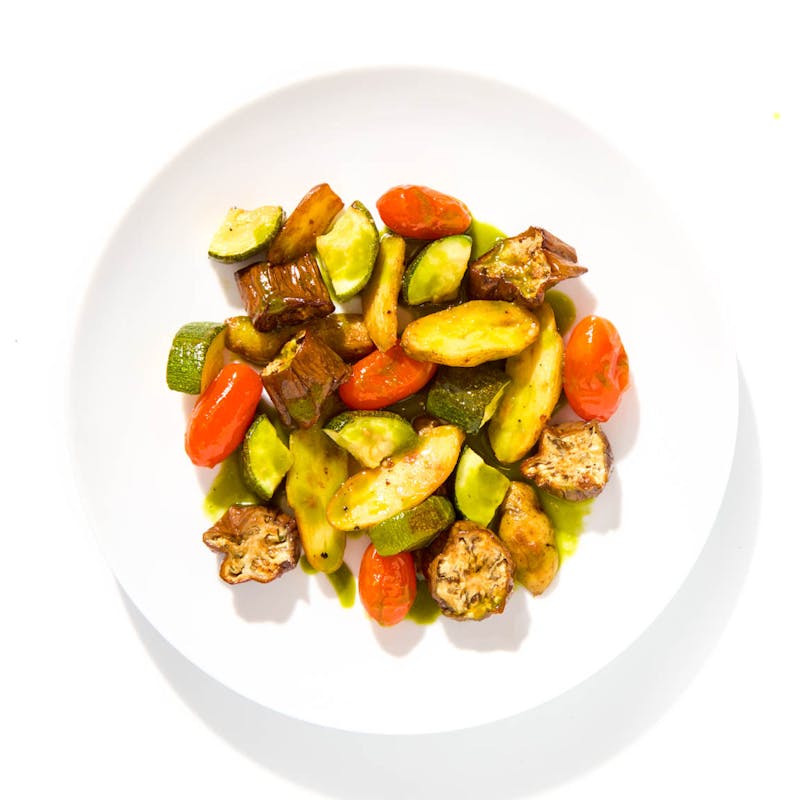 Roasted zucchini, blistered cherry tomatoes, and golden fingerlings form the base of this vibrant veggie side—but it’s the Thai chimichurri that steals the show. Made with green curry paste, mirin, Thai basil, and maple syrup, the sauce brings a zesty punch. Drizzle it on or dip as you go.