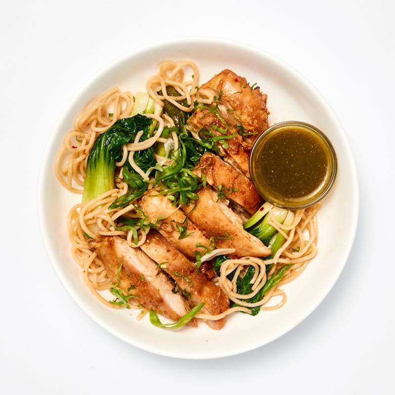 This dish was inspired by a noodle cart at the Yaowarat night market in Bangkok's Chinatown. Tender chicken thigh is braised to perfection in a sweet and savory ginger-soy sauce and served with noodles and baby bok choy. A Thai chili vinaigrette with more ginger and scallions pack the dish with even more bold, balanced, irresistible flavor.