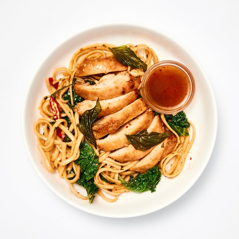 Canola Oil, Pad Kee Mao Sauce, Soy Sauce, Chicken Thigh, Canola and Olive Oil Blend, Onion Powder, Black Pepper, Thai Basil, Garlic, Thai Red Peppers, Kosher Salt, Linguine, Granulated Garlic, Kale, Thyme, Oyster Sauce, Paprika