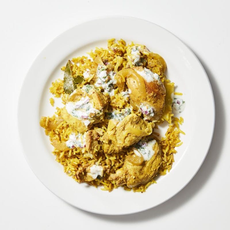 Chicken Thigh, Canola and Olive Oil Blend, Bay Leaf, Habanero Peppers, Turmeric, Red Onion, Mint, Plain Yogurt, Black Pepper, Garam Masala, Cinnamon Stick, Cilantro, Garlic, Cinnamon, Onion, Basmati Rice, Kosher Salt, Lemon Juice, Ginger, Coconut Yogurt