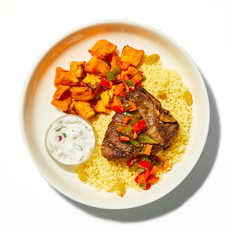 Lamb Loin Chop, Canola and Olive Oil Blend, Habanero Peppers, Sweet Potatoes, Extra Virgin Olive Oil, Fish Sauce, Carrots, Red Onion, Mint, Tamarind Paste, Black Pepper, Golden Raisins, Cilantro, Garlic, Honey, Kosher Salt, Green Bell Pepper, Red Bell Pepper, Couscous, Cayenne Powder, Coconut Yogurt