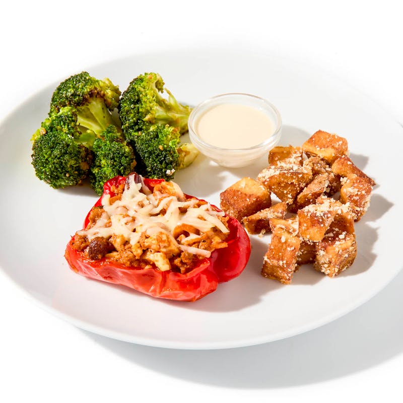 In this Peruvian-style dish, a red bell pepper is filled with spiced ground beef cooked down with tomato, garlic, onion, and aji amarillo, then folded with raisins, chopped peanuts, and slices of boiled egg. It’s topped with mozzarella, then baked until tender and golden. On the side: roasted potatoes tossed in garlic-parsley butter and finished with Parmesan, plus simply sautéed broccoli for balance.