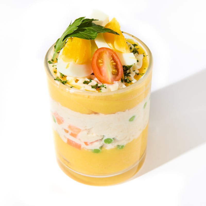 A chilled classic from Lima’s coast: zesty mashed potatoes laced with aji amarillo and lime, layered with creamy chicken salad and pops of sweet cherry tomato and boiled egg. A scatter of fried quinoa on top brings the texture that makes this dish sing.