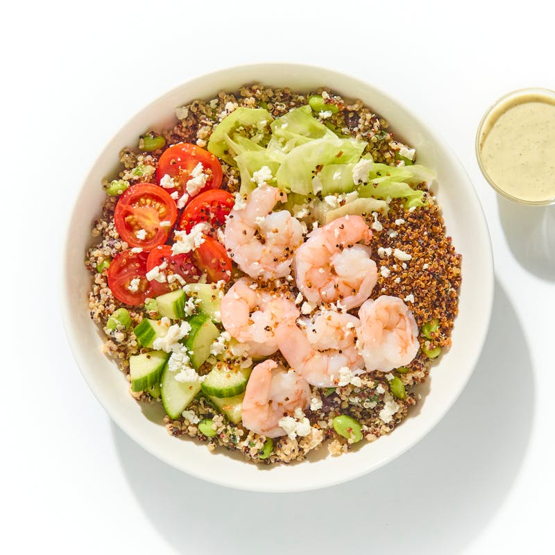 Shrimp, Edamame, Tri-color Quinoa, Cherry Tomato, Cucumber, Canned Black Beans, Vegan Feta, Vegan Mayonnaise, Silken Firm Tofu, Iceberg Lettuce, White Vinegar, Light Soy Sauce, Cucumber, Mint, Yellow Mustard, Rice Wine, Yuzu Juice, Garlic, Seasoned Rice Wine Vinegar, Black Pepper, Kosher Salt, Cumin, Monosodium Glutamate, Shiitake Mushroom, Kombu