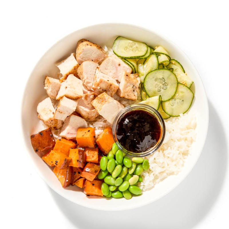 Chicken Breast, Sweet potato, Jasmine Rice, Edamame, Gluten Free Tamari, Cucumber, Demerara Sugar, Coconut Milk, Canola Oil, White Balsamic Vinegar, Furikake Nori Seasoning, Sweet Miso Sauce, Plum sauce, Kosher Salt, Corn Starch, Sugar, Rice Wine Vinegar, Rice Wine, Kombu, Light Brown Sugar, Black Pepper, Lemongrass, Garlic, Mustard Seed