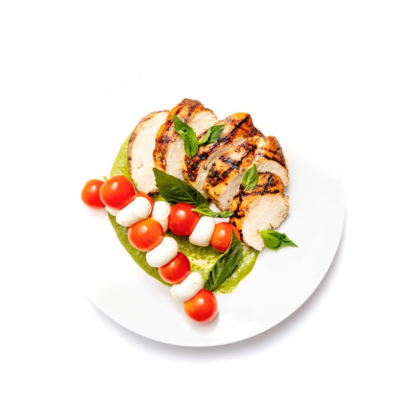 Warmer days often leave us craving lighter options and Chef Chase has the ideal solution. A juicy chicken breast marinated with classic Italian seasonings like garlic, herbs, and lemon, then grilled to perfection gets served atop a traditional Caprese salad. With sweet cherry tomatoes, fresh mozzarella, and fresh baby arugula, as well as delectable basil pesto, this dish is a crowd-pleaser, any day of the week.