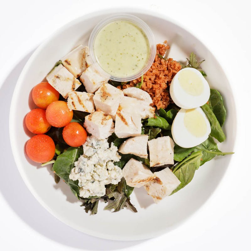 This is a perfect option for those on-the-go and looking for a protein-packed meal that won't weigh them down. Perfectly grilled chicken breast is sliced and served atop a classic Cobb salad with baby kale, cherry tomato, blue cheese and hard-boiled egg. Chef Chase swaps in smoky vegan bacon bits and adds a lightened up creamy avocado dressing to drizzle atop the whole salad. Toss, toss, toss, and enjoy!