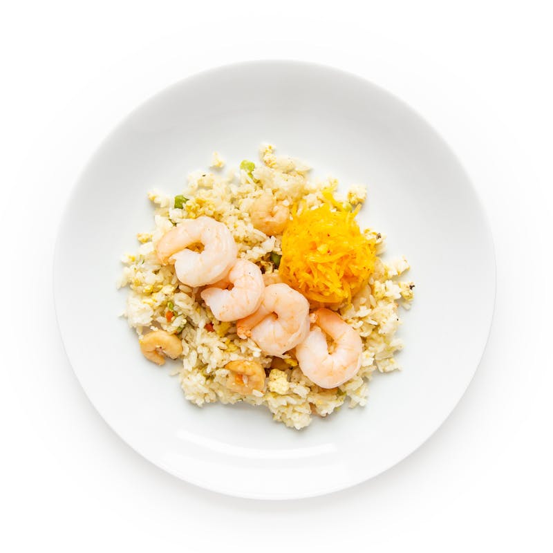 Canola and Olive Oil Blend, Butter, Onion Powder, Garlic Powder, Sake, Calrose Rice, Shrimp, Black Pepper, Corn, Garlic, Corn Starch, Zucchini, Onion, Light Soy Sauce, Kosher Salt, Green Peas, Carrots, Crispy Fried Onions, Light Brown Sugar, Green Onion, Ginger, Kombu, Rice Wine, Paprika