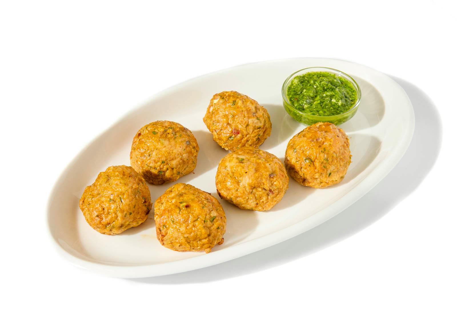 These keto-friendly chicken meatballs are seasoned with herbs and shawarma-inspired spices. Served with a bright green zhoug for spicy, herby contrast.