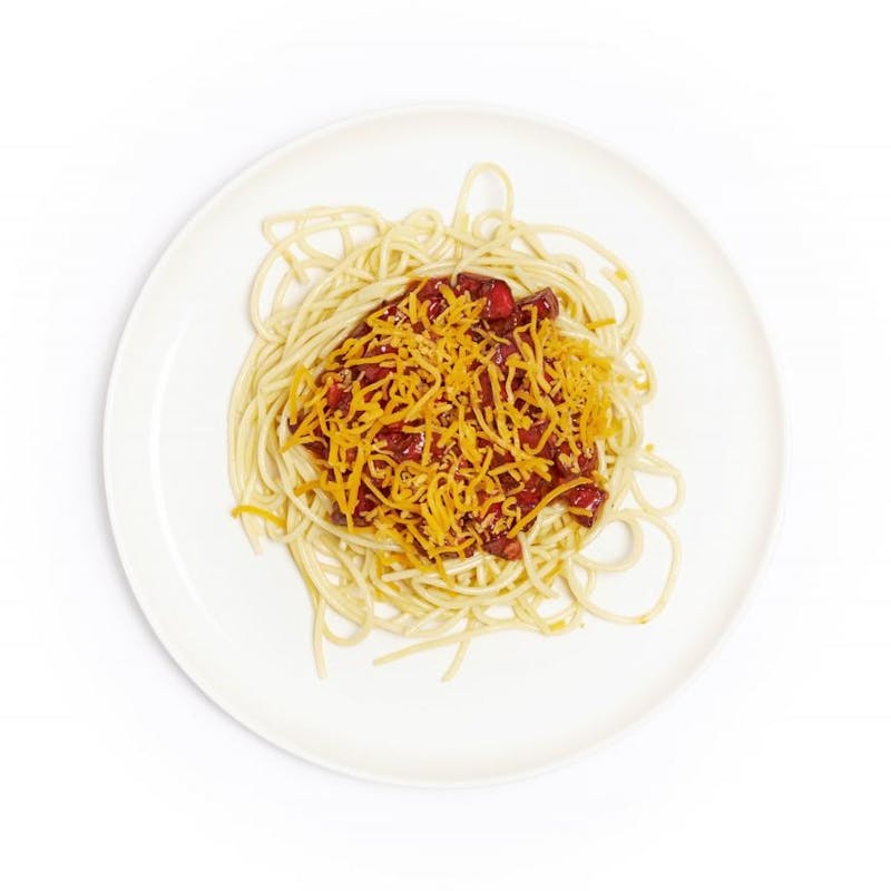 Ground Beef, Tomato Sauce, Spaghetti, Longanisa Pork Sausage, Ketchup, Tomato Paste, Onion, Mild Cheddar Cheese, Red Bell Pepper, Garlic, Extra Virgin Olive Oil, Sugar, Crushed Red Pepper, Kosher Salt