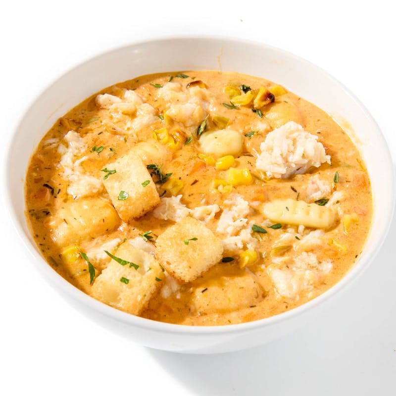 Gnocchi, Canola and Olive Oil Blend, Bay Leaf, All Purpose Flour, Butter, Carrots, White Bread, Celery, Vegetable Base, Garlic Powder, Crab, Black Pepper, Garlic, Sweet Paprika, Heavy Cream, Onion, Kosher Salt, Corn, Thyme, Whole Milk, Italian Parsley