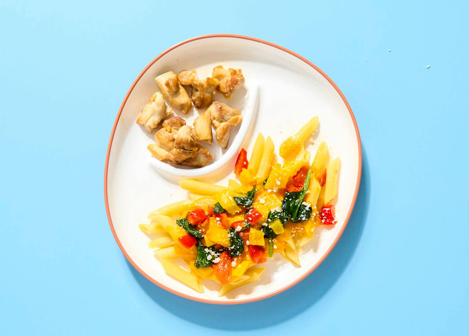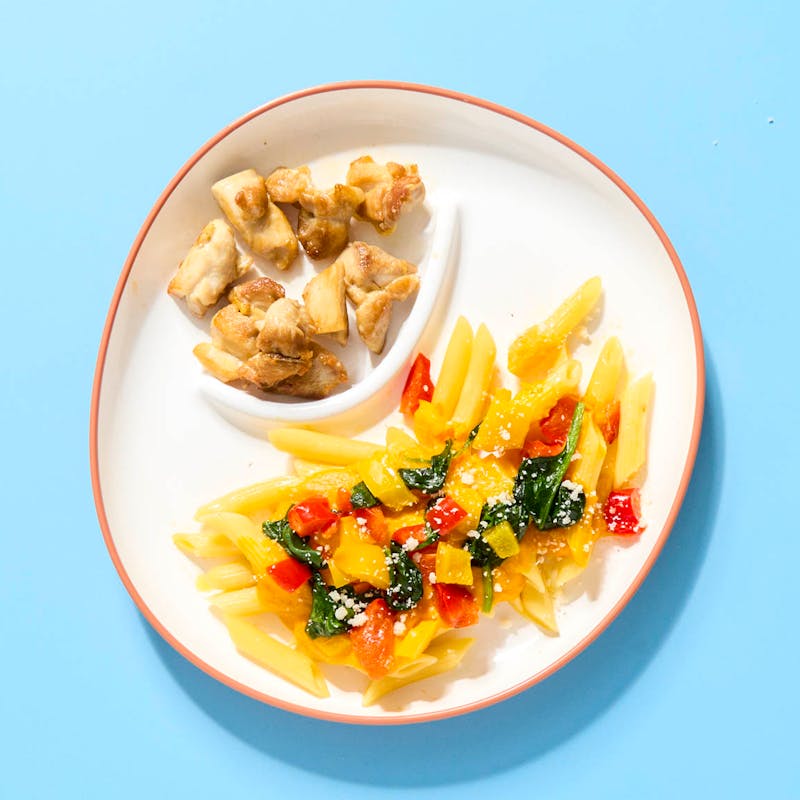 This vibrant, veggie-forward meal makes nutritious feel exciting. Penne pasta is tinted from yellow beet juice and topped with a naturally sweet and silky carrot-cream sauce. Sautéed peppers and spinach bring extra color and texture. On the side, marinated chicken thighs are stir-fried until tender and kept separate for easy mixing. A pinch of grated Parmesan comes in its own compartment, giving kids the option to finish their dish their way.