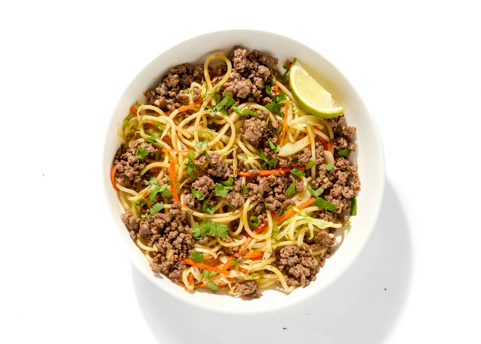 Ground beef meets wok-seared chow mein noodles and shredded vegetables, all tossed in a garlicky, sweet-salty black pepper sauce. A squeeze of lime and chopped cilantro at the finish brighten up this crave-worthy dish.