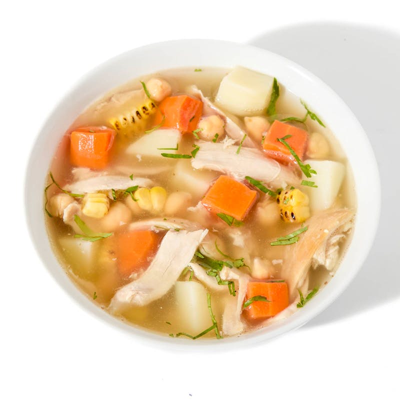 Inspired by Latin American comfort food, this clear chicken broth is steeped with garlic, tomato, and herbs, then filled with marinated chicken, red potatoes, corn, chickpeas, and fresh epazote.