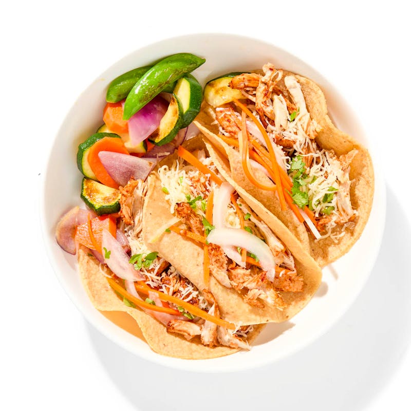 Chef Santos keeps it classic: pulled chicken simmered in smoky chipotle, tucked into soft corn tortillas with mozzarella and fresh cilantro. Roasted veggies and sweet pickled onions on the side round out the plate with color and crunch.