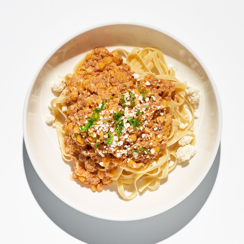 Pork Chorizo, Extra Virgin Olive Oil, Fettuccini, Canned Corn, Cilantro, Garlic, Heavy Cream, Onion, White Pepper, Kosher Salt, Queso Fresco, Tomato Sauce