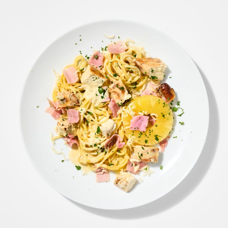 Craving something fresh, tropical, and totally ingenious? Chef Santos takes everything great about sweet-savory Hawaiian pizza, and transforms it into an irresistible pasta dish. Luscious cream sauce, studded with tender shredded chicken breast and smoky chopped ham, coats every strand of perfectly al dente spaghetti, topped with melty Mozzarella cheese, sweet pineapple, and fresh chopped parsley. It’s an unforgettable combination of flavors!