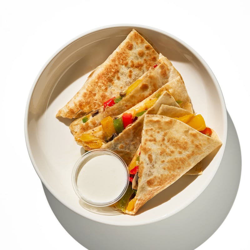 Three kinds of mushrooms — oyster, shiitake, white — are combined with sautéed bell peppers, herbs, spices, and a gooey blend of melted mozzarella and cheddar to create one rich and satisfying quesadilla for any day of the week. Sour cream is of course included on the side!