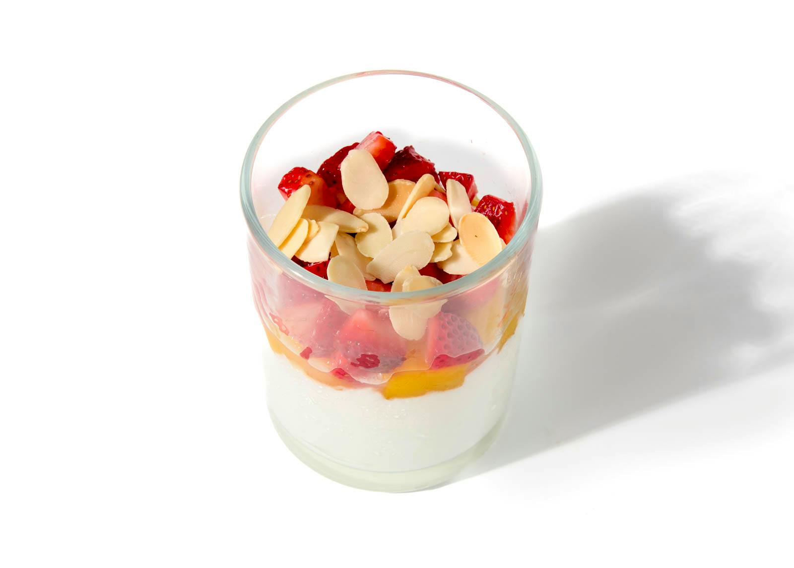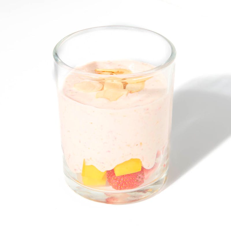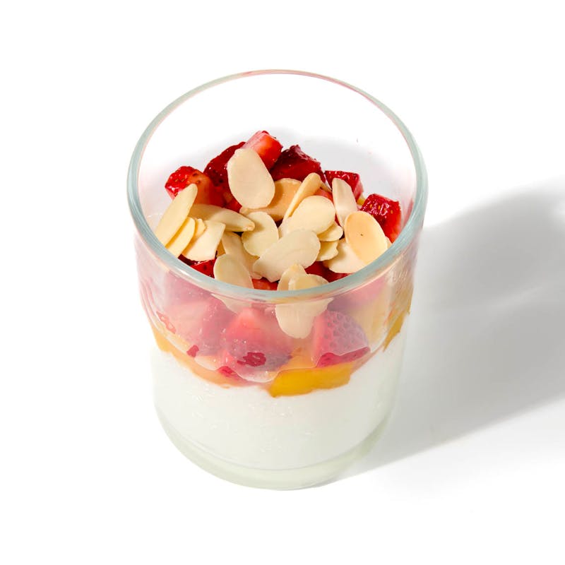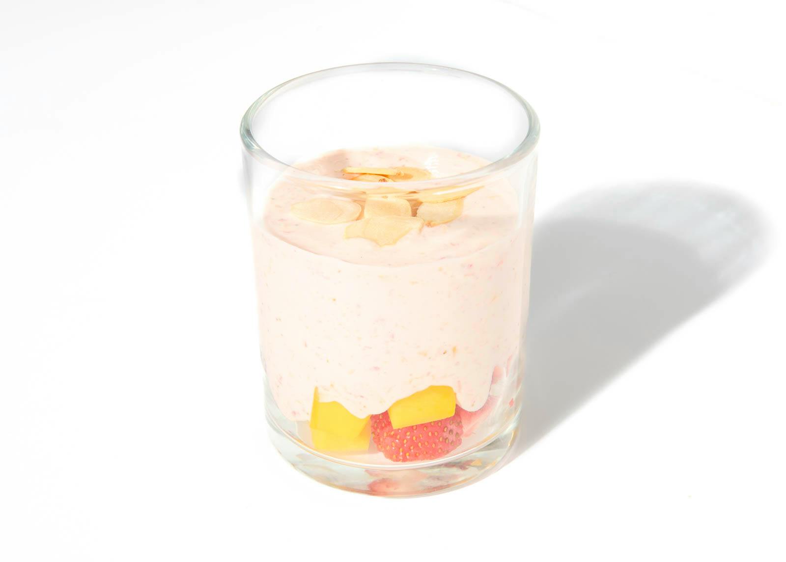 Cool, creamy yogurt gets the fruit-stand treatment in this light, refreshing bowl. Chunks of ripe mango and sweet strawberry purée swirl into the tangy base, while a scattering of blanched sliced almonds adds a welcome crunch. It’s simple and satisfying—like the yogurt parfait’s more elegant cousin. Perfect as a breakfast or midday bite, this dish leans on freshness and texture instead of added sugar to do the heavy lifting.