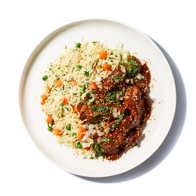 Spice, Parsley, Dried, Chicken Thigh, Extra Virgin Olive Oil, Red Mole Paste, Basmati Rice, Kosher Salt, Green Peas, Carrots, Chicken Base, Chicken Stock, Toasted Sesame Seeds
